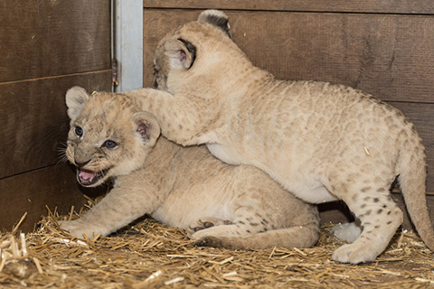 Der Tierpfleger vermutete bereits seit einiger Zeit, dass die beiden Löwinnen trächtig sind. Im Vorfeld wurden auch mehrfach Paarungen beobachtet. Da die beiden Löwenmütter aber bereits ältere Damen sind, war man etwas unsicher, ob es tatsächlich noch Nachwuchs geben würde. Umso grösser war die Freude, als klar wurde, dass gleich beide Löwinnen Junge geworfen hatten. Vater Mbali durfte die ganze Zeit bei den Weibchen bleiben. Die Mütter erlauben ihm sogar, sich mit ihnen in die enge Wurfkiste zu legen, wobei er sich richtiggehend an den Rand quetschen muss.