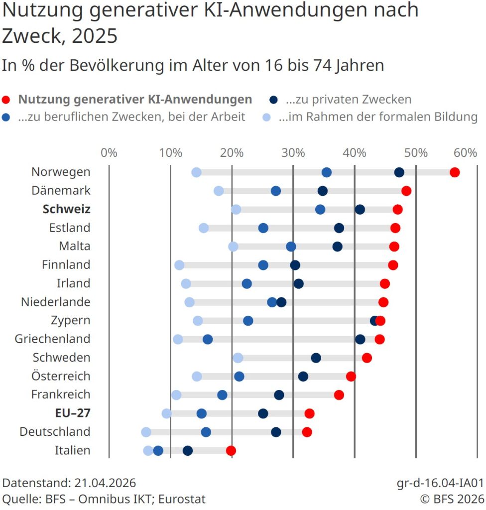 Drei Jahre nach ihrer Bereitstellung im Internet sind generative KI-Anwendungen in der Bevölkerung der europäischen Länder bereits erstaunlich weit verbreitet. In der Schweiz hat fast die Hälfte der 16- bis 74-Jährigen (47 %) in den drei Monaten vor der Befragung nach eigenen Angaben generative KI-Anwendungen genutzt. Damit liegt die Schweiz hinter Spitzenreiter Norwegen (56 %) und Dänemark (48 %) auf dem 3. Rang der europäischen Länder.