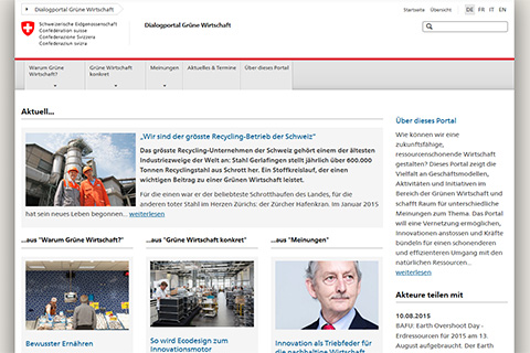 Wie lässt sich die Umweltbelastung des Schweizer Konsums und der Wirtschaft senken und gleichzeitig die Wettbewerbsfähigkeit steigern? Was tun Schweizer Unternehmen trotz Frankenstärke schon heute in diesem Bereich? Welche Rolle spielt die Schweiz international? Das Dialogportal www.gruenewirtschaft.admin.ch soll Beispiele, Antworten und Meinungen liefern. Aktuell sind auf dem Portal zum Beispiel Reportagen aus dem grössten Recyclingbetrieb der Schweiz, der Stahl Gerlafingen, oder dem neuen Lehmbau von Ricola publiziert.