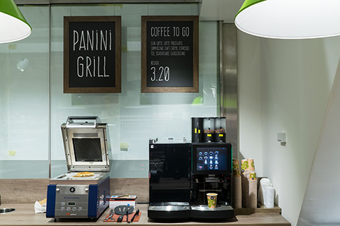 Coffee to go und sogar ein Panini Grill um seine Brötchen heiss zu geniessen