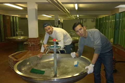 Dürfte bei alten Lokianern Wehmut auslösen: Die Chromstahl Waschtröge, mit mittiger Sand-Seifenschale, die auch schwärzeste Finger wieder sauber kriegte, werden vom Bauteam auf Hochglanz poliert