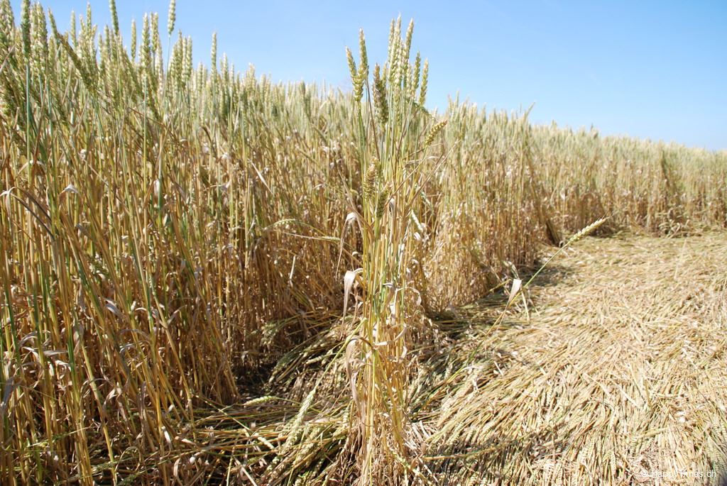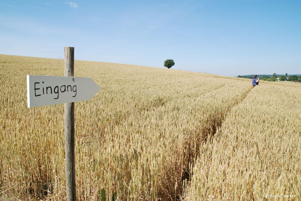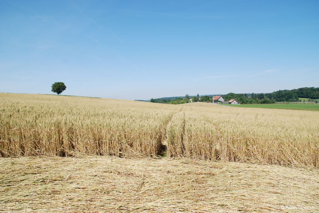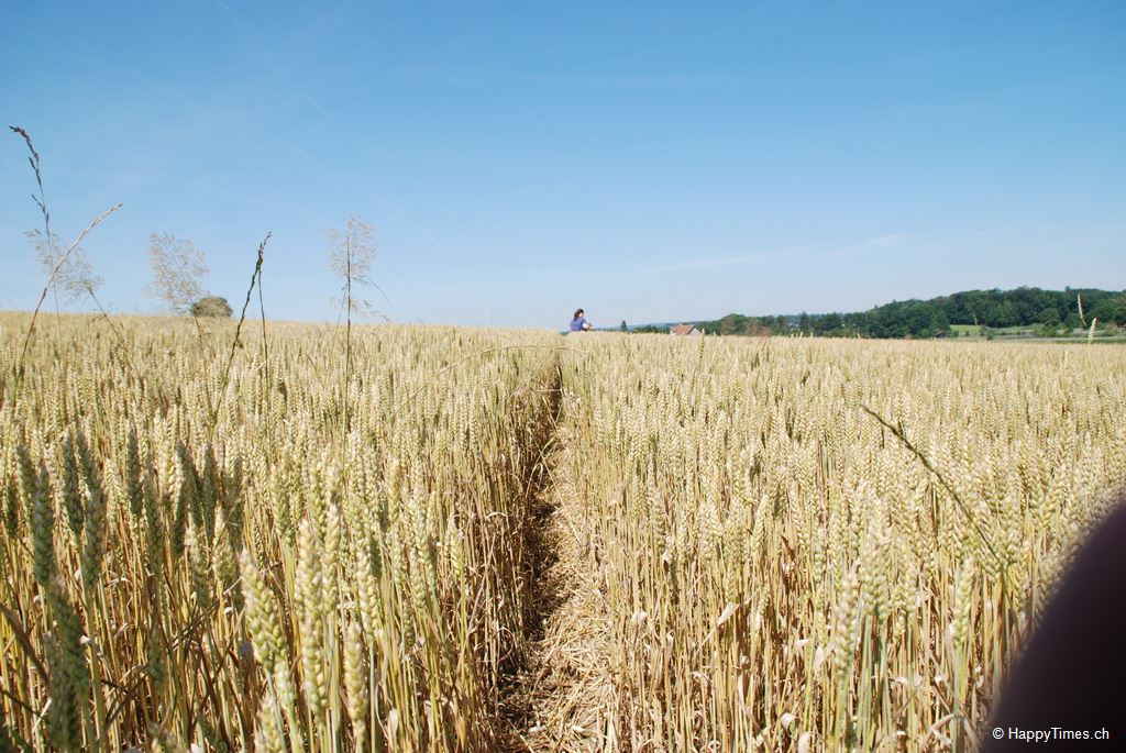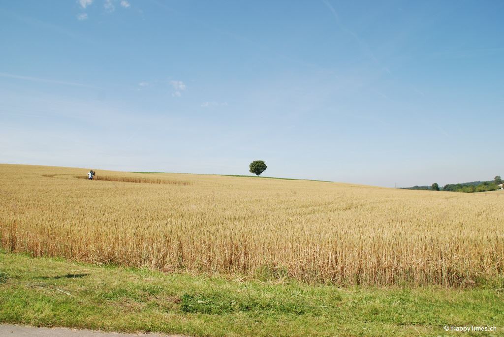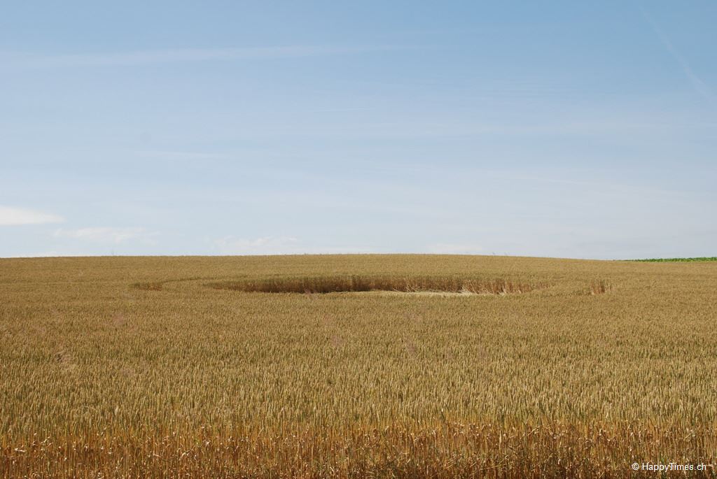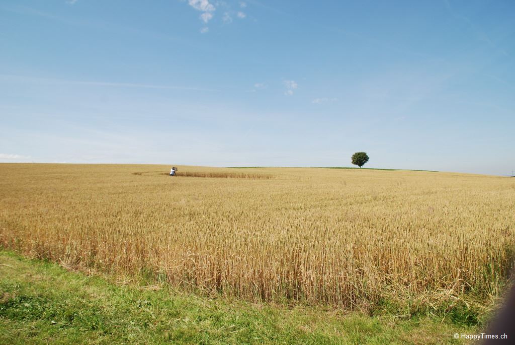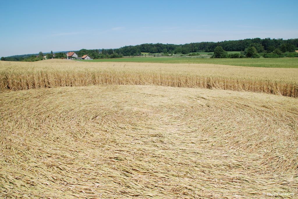 Auf jeden Fall aber ist der Kornkreis mit seinem beachtlichen Durchmesser eine stattliche Erscheinung. Idyllisch eingebettet in die saftigen Auen des Thurgaus beim hübschen Dörfchen Bommen, inmitten gülden wogenden Weizenfelder, die wenig vom Kornkreis entfernt bereits abgeerntet und von apokalyptisch anmutenden Monstermaschinen gierig gefressen und staubflirrend gedrescht werden. Vermutlich halten die Aliens diese gigantischen Mähdrescher für die wahren Herrscher dieser Erde. „John Deere heissen die Titanen auf dem Planeten Erde“, wird in den Alienschulen den gelangweilt einäugig blinzelnden Zyklopenkindern vermutlich gelehrt.