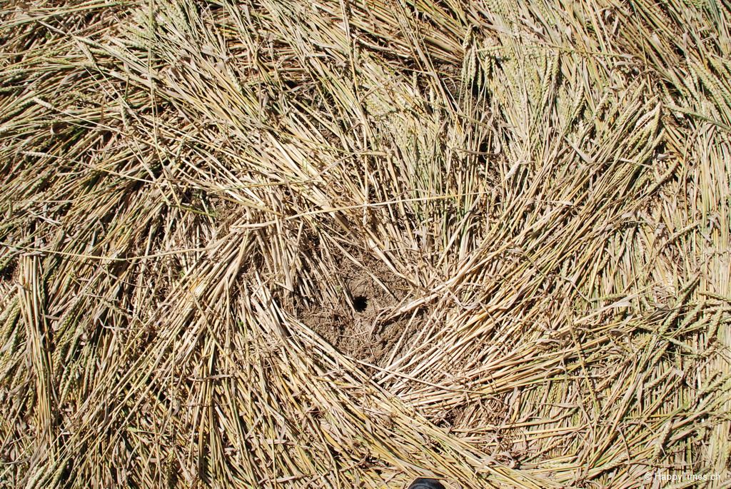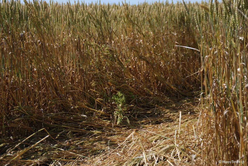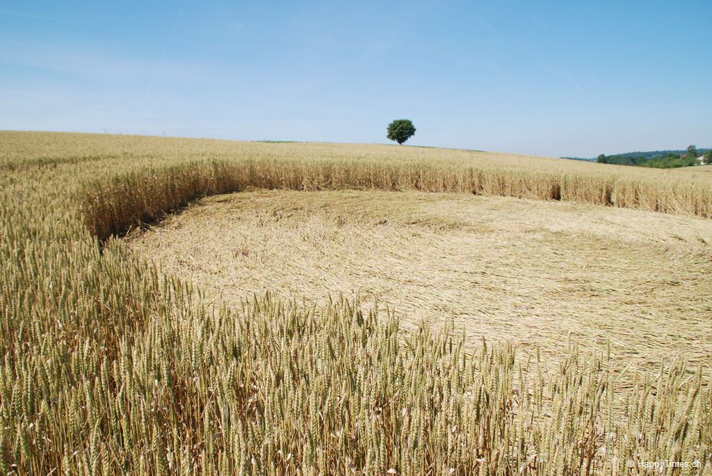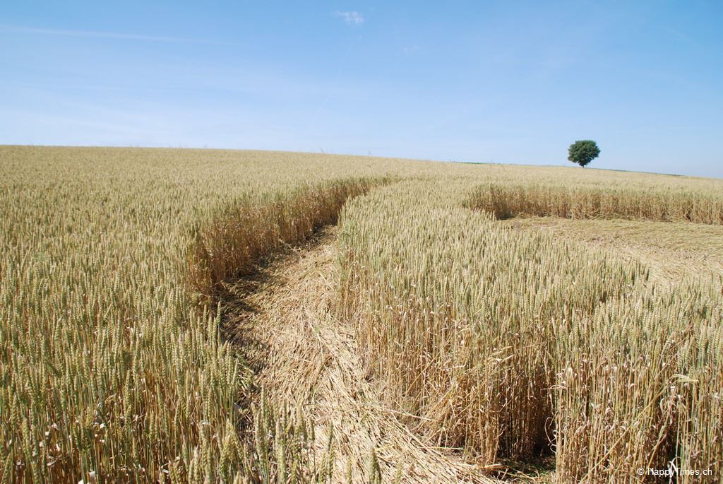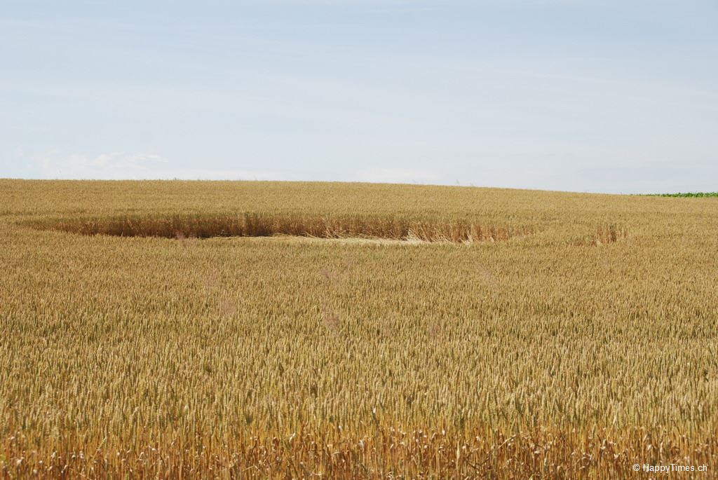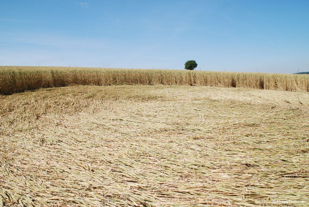 Der Kornkreis besticht durch seine Grösse und die exakte Trennung der stehenden zu den liegenden Halmen. Doch entweder besassen die Aliens, die dieses Kunstwerk bei der Landung mit ihrem UFO ins Getreide drückten, ein etwas unförmiges Flugmodell, oder aber die Lausemädchen- und -Jungs, die den Kreis nächtens anlegten, waren etwas in Zeitnot, denn: Der Kornkreis ist nicht ganz rund und nicht in der Perfektion, wie wir das bei anderen Schweizer Kornkreisen schon selber gesehen haben, sondern der Kreis eiert etwas und ist an einigen Stellen etwas eingebeult. Vielleicht hatte das UFO beim Flug während der letzten Lichtjahre durch unseren Kosmos ein paar Schrammen abbekommen?