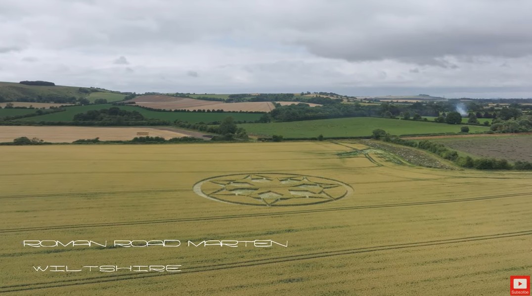 Endlich ist auch im Jahr 2024 wieder ein Kornkreis aufgetaucht. Und zwar an der Roman Road in Wiltshire in der Nähe von Marten, das liegt im Süden von England. Der Kornkreis wurde am 23. Juli 2024 entdeckt und zwar in einem grossen Weizenfeld. Er misst riesige 40 Meter im Durchmesser und besteht aus einer komplizierten 7er Struktur mit 7 Sternen und Dreiecken. Eine hochkomplexe geometrische Anordnung. Marten Marlborough liegt nur etwa 35 Autominuten und 35 Kilometer von den weltberühmten Steinformationen von Stonehenge entfernt.