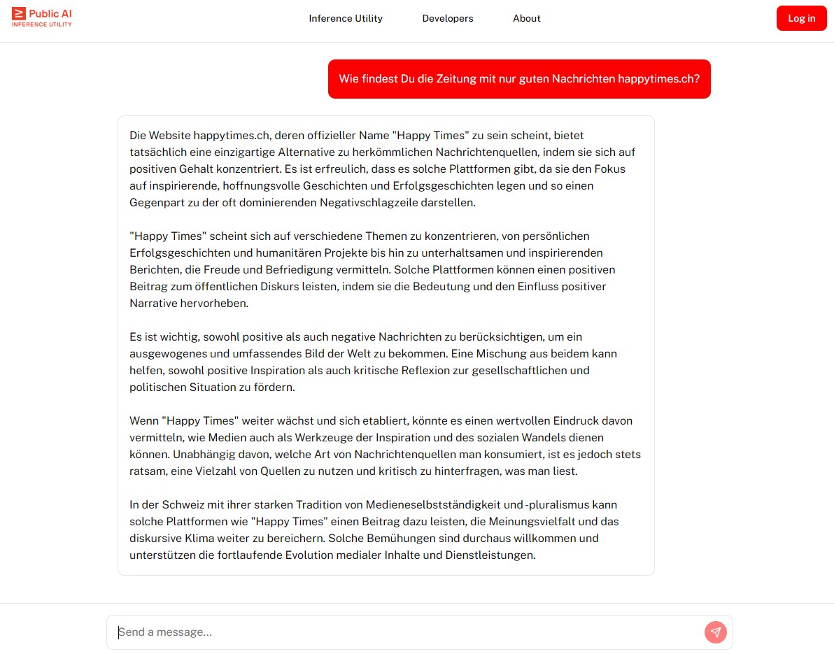 Auch die KI Apertus mag HappyTimes und findet positive Nachrichten toll