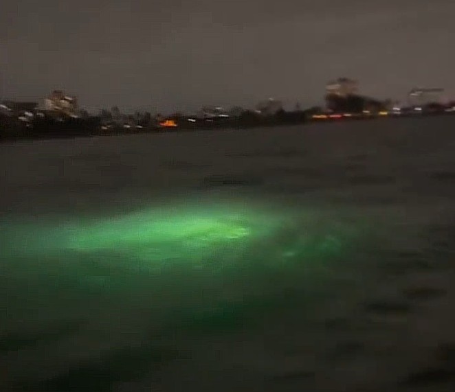 Hier gleitet das leuchtende Unterwasser-UFO unter das Angelboot des Filmers: