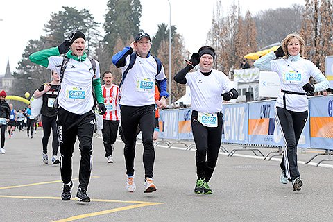 Haben noch genug Puste für einen kleinen Scherz – Sonova-Runner Yves, Bruno, Roger und Ruth, mit der „Hear the World“-Pose