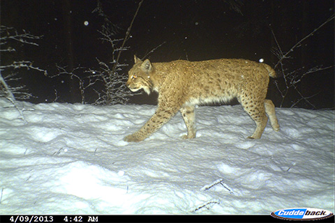 Morgens um 4:42 Uhr in die Fotofalle getappt und geblitzt! Diesem Luchs gefällt es schon seit 2007 im Kanton Luzern, er kann beinahe jährlich bestätigt werden. (Copyright: Kanton Luzern, Abt. Natur, Jagd und Fischerei)