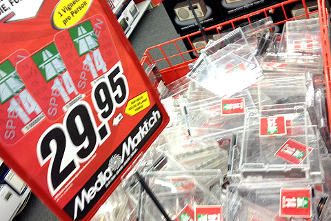 Im MediaMarkt Winterthur zum Beispiel türmten sich am Dienstagmorgen die Sicherheits-Boxen mit den begehrten Vignetten drin, die Schlangen an den Kassen reichten bis weit in die Verkaufsräume hinein. Die Vignetten kosteten im Markt wirklich nur 29.95, eine Vignette durfte pro Person gekauft werden. An gleich vier Kassen wurden die Kund durchgeschleust, fast jede und jeder hatte eine der Plastikboxen mit der roten Vignette drin in der Hand.