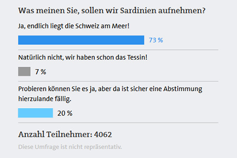 Bereits berichten Radiosender und einige Medien aus Italien und Österreich über den vielleicht zukünftigen 27. Kanton der Schweiz Sardinien. Die Plattform Bluewin.ch machte gestern eine Umfrage „Sollen wir Sardinien aufnehmen?“. Über 4’000 Teilnehmer machten mit, 73% würden sich freuen, Sardinien in die Schweiz aufzunehmen, 20% fanden, dass man es ja mal probieren könne. Somit befürworten 93% der Abstimmenden eine Angliederung von Sardinien an die Schweiz. Nur 7% stimmten dagegen und führten an, dass die Schweiz ja schon das Tessin als südliche Ferienoase habe.