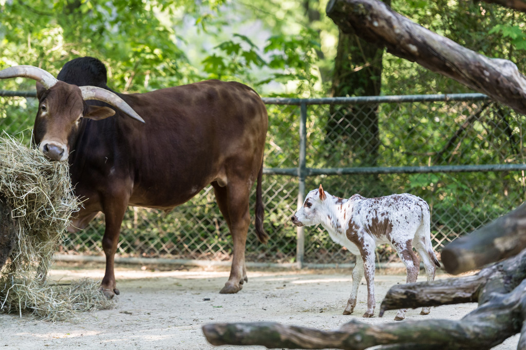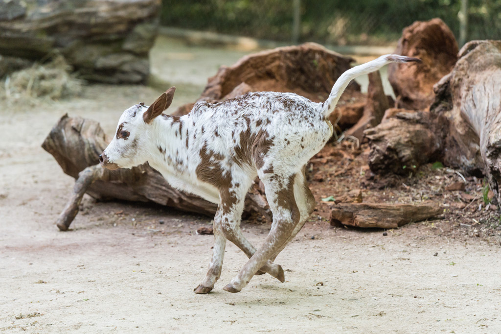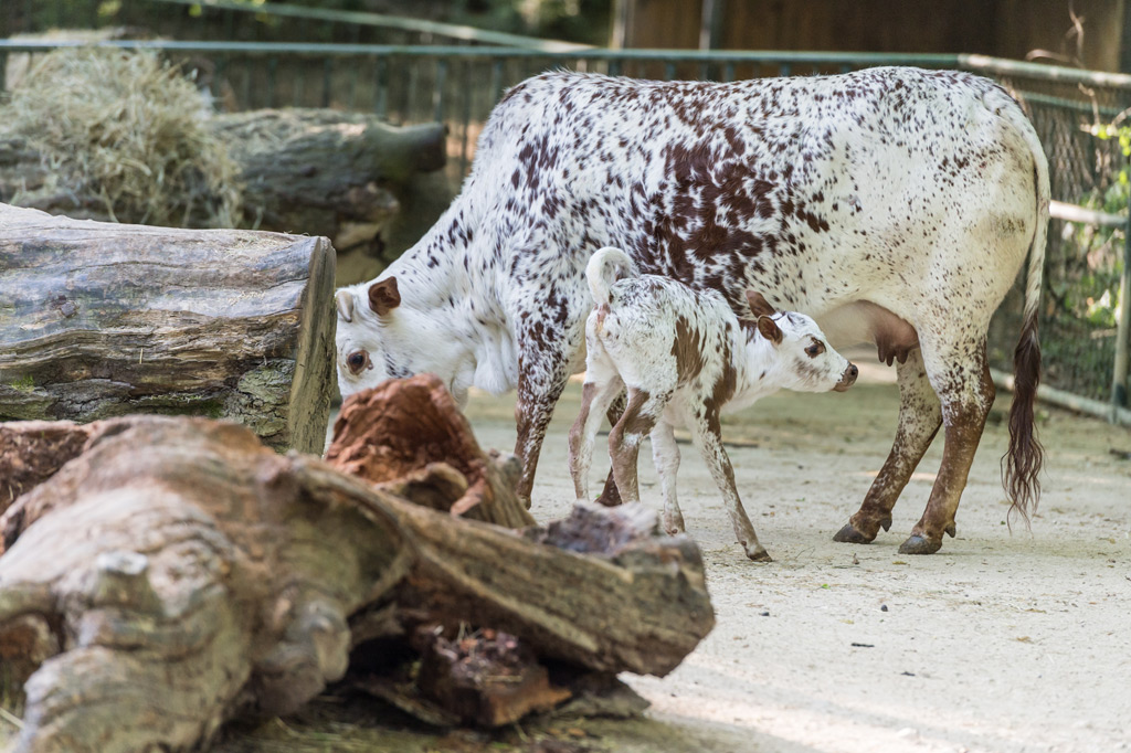 Das Zwergzebu-Kälbchen ist auf der Aussenanlage zur Welt gekommen. In den ersten Tagen war es recht zurückhaltend, auch auf dem Weg vom Stall ins Aussengehe versteckte es sich jeweils hinter seiner Mutter. Nach und nach wurde es immer übermütiger. Neugierig näherte es sich den anderen Zwergzebu-Kühen und suchte nach den Zitzen. Sogar beim Stier schaute es nach, ob vielleicht bei ihm etwas zu holen wäre.