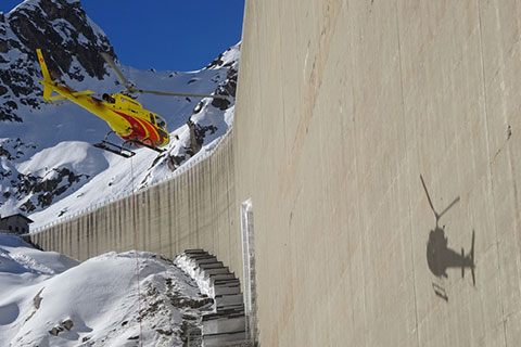 Helikopter transportieren Material zur 115 Meter hohen Albigna Staumauer