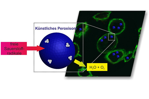 Der Forschungsgruppe um Prof. Cornelia Palivan vom Departement Chemie der Universität Basel ist nun die Herstellung von künstlichen Peroxisomen gelungen, die das natürliche Organell imitieren. Die Forschenden entwickelten ein auf polymeren Nanokapseln basierendes Zellorganell, in das zwei verschiedene Arten von Enzymen eingeschlossen sind, welche freie Sauerstoffradikale zu Wasser und Sauerstoff umwandeln können.